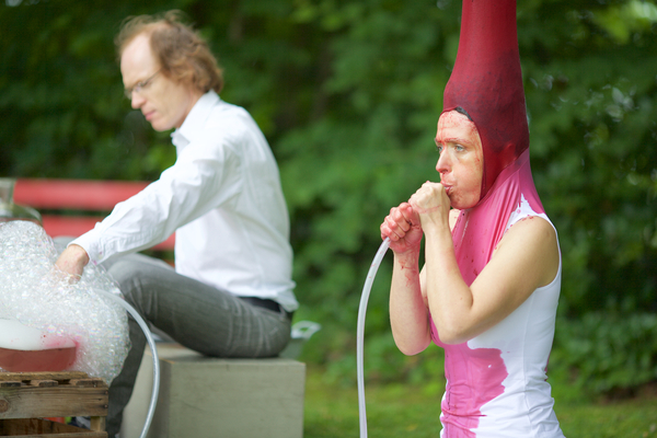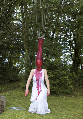 Materiale: ciotola di vetro con bacche, abiti bianchi, estensione del collare con corde attaccate all'albero, tubo in PVC, ciotole di vetro con acqua saponata su scatole di legno come strumenti a percussione.