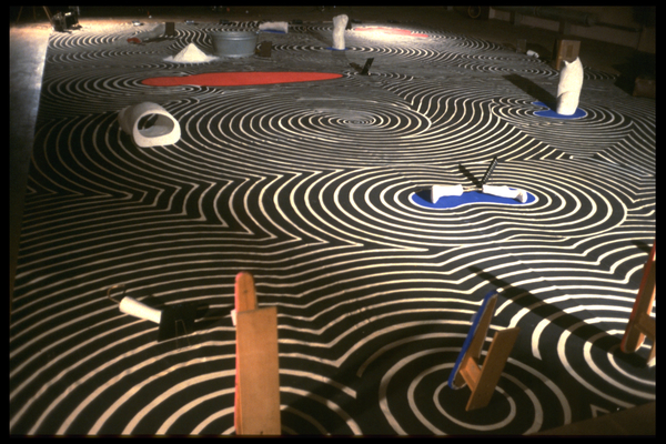 The project "Das Innere der Sicht" shows inner images of buried, repressed states - of love, emotional pain and loneliness - of inner emptiness - of losing oneself. Cramping. Madness. Everyday rituals that try to avoid the crisis, the fall - to whitewash it. Protective mechanisms to avoid the mirrors. The fear of change. A floor painting with swirl and labyrinth-like patterns forms the action area (84m2 painted on canvas). The floor is intended to represent the realization of the inner movement (spiral/wave/swirl) in all its contrasts. Dissolution of previous regularities, rhythms, standpoints and views. The texts come from the French surrealist poets. (1988)