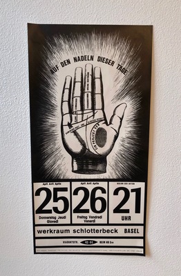 Le projet "Sur les aiguilles de ces jours" n'est pas un traité sur le thème de la mort. Il prend en compte la mort comme un point incontournable dans la vie d'une personne. Nous montrons la mort sous les formes les plus diverses. La mort d'un amour, d'une enfance, d'un rêve, d'une illusion, d'un moment. La fin qui peut aussi être un nouveau départ. Nous reprenons les peurs, les visions et les cultes que nous avons rencontrés jusqu'à présent en rapport avec la mort. Mais pas dans une prétention scientifique à l'exhaustivité, plutôt teintée de nos fantasmes et de nos expériences. L'extinction. Dissolution de la vie. Laisser tomber. Décomposition. Putréfaction. La fusion. Les peurs de la finitude de la vie et de ne pas savoir ce qu'il y a après la mort. Les rituels de laisser des traces - de se documenter - de ne pas tomber dans l'oubli - de construire des garde-fous pour ne pas se perdre - de tomber dans le vide - de ne pas vouloir se laisser tomber. Les passages de texte proviennent des poètes surréalistes français. (1991)