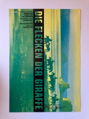Dabei ist ein assoziatives, performatives Projekt entstanden, in dem die gesprochene Sprache nur marginal verwendet wurde. Die Musikmixes, live erzeugt mit Hilfe diverser Plattenspieler, der Umgang mit Gegenständen und ein eigenwilliges Bewegungsvokabular waren wichtige Elemente dieser Performance. Ein schmaler Aufkleber mit dem Titel „Die Flecken der Giraffe“ wurde in der Stadt Zürich im Vorfeld der Aufführungen an diversen Orten angebracht. Dann gab es etwas später ein Set von acht kleineren Flyern und dazu ein Plakat - mit Siebdruck auf Makulatur gedruckt. Somit ist jedes Plakat ein Unikat.