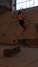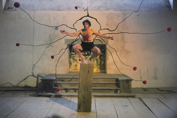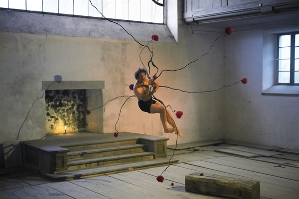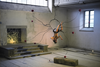 Un homme partiellement nu se tient debout dans un bloc de bois de 1,2 m de haut, les mains sur les yeux. Au harnais qu'il porte est attaché un enchevêtrement de longues barres métalliques irrégulières avec des pompons roses aux extrémités. Lentement, il commence à s'enfoncer au niveau des genoux et à se pencher. Ce faisant, les barres commencent à se séparer et à s'élever dans les airs derrière lui, tandis que son corps en descente exerce une tension sur un câble qui le relie au plafond. Plus il descend, plus il devient instable, et les barreaux ondulent comme s'ils étaient vivants. Enfin, il tombe du bloc, qui s'écrase sur le sol. L'homme est rattrapé par les barreaux qui, derrière lui, s'étendent et s'élèvent en lignes rayonnantes, évoquant des ailes. L'homme et les barreaux forment ensemble un mobile très cinétique.