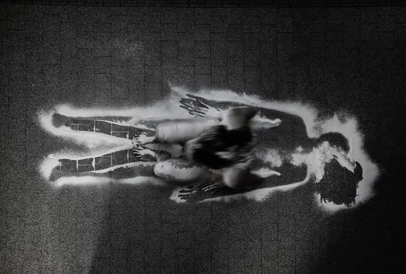 D'en haut, nous apercevons un corps de femme étendu dans le sens de la longueur sur le sol en dalles et recouvert de poussière de farine. Bientôt, la tête s'agite, puis le haut du corps se redresse lentement. La femme va peu à peu se lever, se dépoussiérer de la farine et s'éloigner de l'espace pictural. Seules les traces de son corps - les contours de sa silhouette précédemment couchée, dessinés avec de la farine - subsistent. Blancs sur noirs, ils témoignent de la "pulvérisation" d'Andrea Vogel, renvoient à la présence éphémère de l'artiste, estompent la corporéité et la désincarnation.
