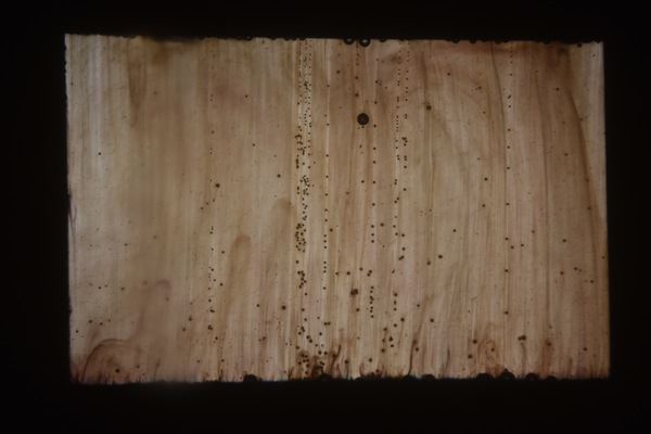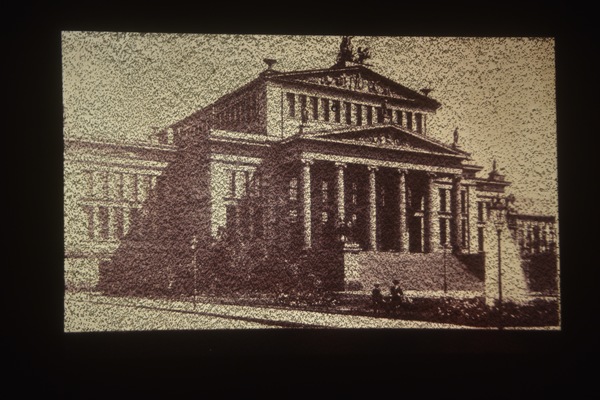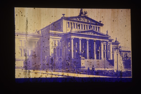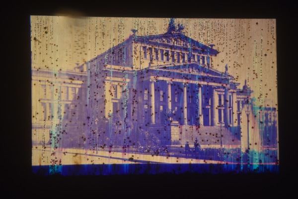 A collection of architectural history slides with images of famous buildings was shown with a converted slide projector and simultaneously dissolved with chemicals. After each projection, the chemical solution was poured into a small bottle and placed on a shelf together with the emptied slide.