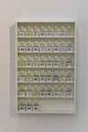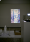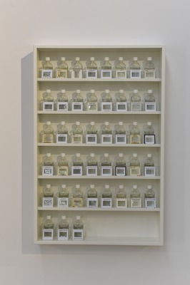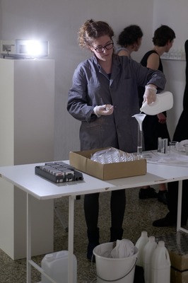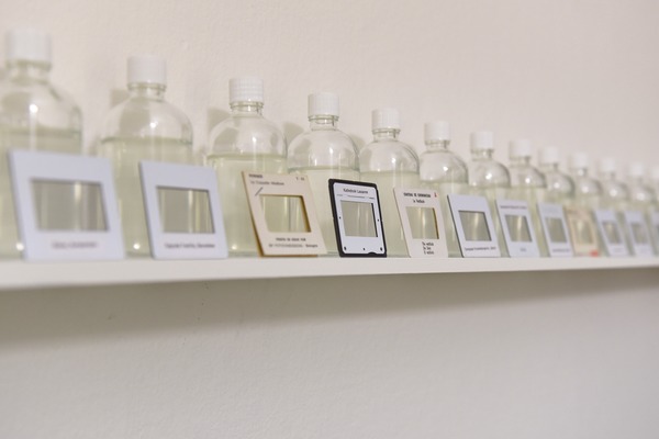 Une collection de diapositives d'histoire de l'architecture représentant des bâtiments célèbres a été projetée à l'aide d'un projecteur de diapositives reconverti et dissoute simultanément avec des produits chimiques. Après chaque projection, la solution chimique était versée dans un flacon et posée sur une étagère avec la diapositive vidée de son contenu.