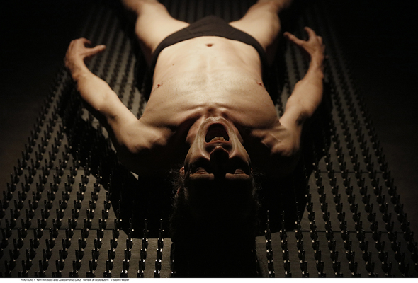 Premier volet d’un triptyque sonore, Frictions 1 – 1568 est une création du performeur Yann Marussich et de l’artiste sonore romande Julie Semoroz : une rencontre entre le corps et le son. Le performeur est allongé sur une surface composée de 1568 jacks disposés tête en haut, rappelant un lit à clous. L’empreinte de la peau de Yann Marussich est transformée en son par ces centaines de capteurs sur lesquels elle repose. Le tout forme une sorte de méga-antenne, une machine vivante productrice de son organique.