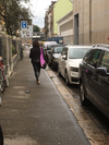 Je continue à descendre la rue, dans un sens et dans l'autre, tandis que de la poudre blanche continue à sortir de mon sac (rose).