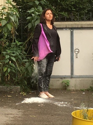 Ensuite, j'emporte un sac contenant une poudre blanche, ainsi je marche dans la rue qui est également laissée derrière. Des traces et des lignes blanches sont laissées sur la route. Je vais et je viens tout au long de la route. Parfois, je me tiens quelque part dans la rue, et la poudre blanche sort constamment de mon sac.