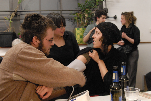 - Lena Lengsfeld and Raphael Stucky, Interioremotioncorpologen, measure the body temperature and blood pressure of those present. They transfer the body temperatures to a mood thermometer and use it to create a mood picture. From the blood pressure, they calculate the pressure distribution in the room and create a movement model of the visitors.