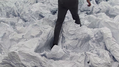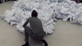 1000m2 of paper, seven times the floor space of the exhibition room, have been glued together to form a single surface and crumpled, creased and pressed into a bale measuring 160 x 180 x 70 cm in days of manual labor. During the performance, I cut the white cords that hold them together and separate the paper masses from each other again, carefully spread them out in the room by pulling them, or I put my whole body between them, crawl underneath them and let them rise into the air. The folds give the 80-gram writing paper stability. The sculpture created for the vernissage fills the large skylight room for the duration of the exhibition. It is geological and glaciological, world-creating and painterly.