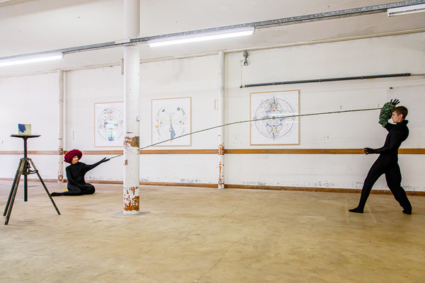 Interagiamo l'uno con l'altro in tute nere nello spazio espositivo. I nostri corpi sono modellati da corde di feltro. Durante la performance avviene uno scambio e un rimodellamento, un flirt e una lotta reciproca. Idee e impulsi vengono assorbiti, le forme si trasformano e le forze si danno.