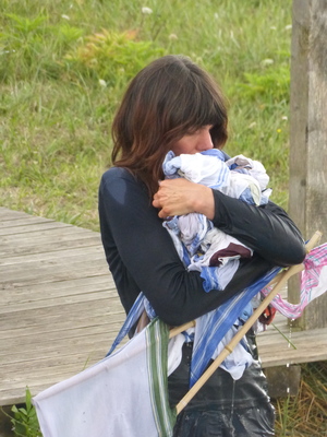 I walked around the Château de Monthelon with a sail made from my father's handkerchiefs sewn together at the corners. As I walked on the field, the sail rose into the air and as I walked, I dragged it behind me, the cloth, which now looked like a train, jerking on the ground. I entered the swimming pool with it, walked through it, pulled the wet cloth out of the water at the other end and pushed it out.