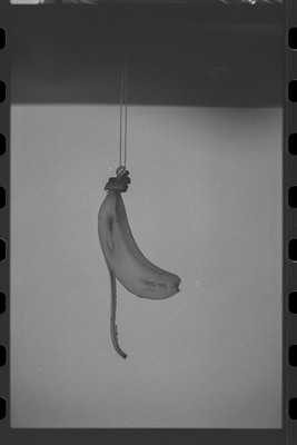 Bananen-Kisten, Bananen, Text-Plakate, Schnüre und Klammern, Klebeband, Audio-Kassetten, Dia-Projektion