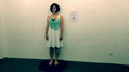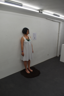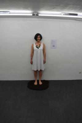 Part of a series of works under the title "il cuntrari d'alv/the opposite of white" which deals with the different aspects of the colors green and white. These are the dominant colors in the alpine habitat, which is determined by snow-white winters and the short green vegetation period. The winter-white dress becomes a canvas and the chlorophyll green jewels on the chain melt over the dress. As the snow and ice melt, they are displaced and the green chlorophyll of the vegetation increasingly takes their place.