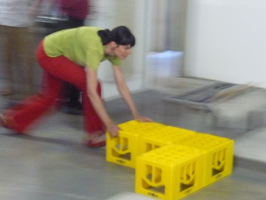 Je glisse différentes constellations de quatre tasses de bière jaunes dans une piste longitudinale en creux au sol. La piste se remplit lentement. Des sons de différentes origines du jeu informatique Tetris retentissent. Entre-temps, je prends également les places des briques de Tetris et je me tiens droit, je m'assois, je plie le haut du corps à angle droit, etc. et je monte sur les tours ainsi créées. Je donne des coups de pied dans les tasses de bière individuelles qui n'ont pas de support, de sorte qu'elles s'écrasent bruyamment au sol. Dès que la piste s'est remplie, la performance est terminée, comme dans un jeu vidéo.
