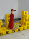 L'espace du bâtiment de service avec ses pistes en creux dans le sol m'a inspiré pour la performance. J'ai également découvert les tasses de bière jaunes sur place. J'en ai commandé 100 pour la performance.