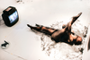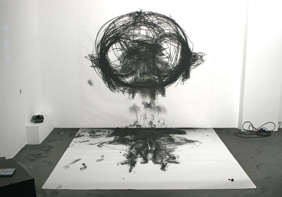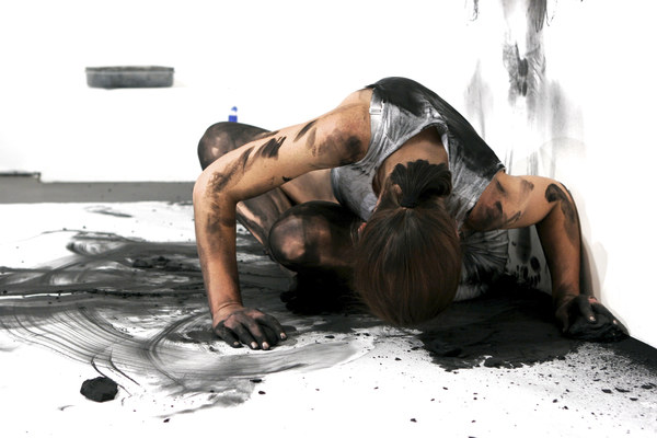 A fitness lesson by Jane Fonda is shown on a monitor, intended as a join-in program for at home. Bucher, Claudia; counteracts the cult of the body and fitness by groaning as she follows it. The wall and floor are extensively covered with paper. The artist holds black chalk in both hands and traces each movement on the paper. The paper becomes more and more a drawing and the performer more and more a black sculpture.
