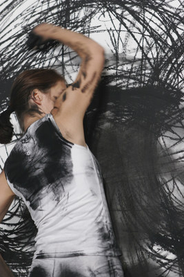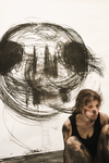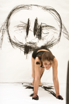 Bucher, Claudia; draws images of female clichés when she parodies the idea of a well-trained fit Hollywood9star by giving herself fully into "JANE FONDA'S WORKOUT BY Bucher, Claudia;". Bucher, Claudia; completes her fitness training in front of the gallery audience on large sheets of paper that she has stretched out under and behind her. She holds charcoal pencils in both hands, and her movements can be seen on the papers as wild expressions of increasing exhaustion. There is something tragicomic about the performance, irony as well as despair about the imposed "condition féminine". The radiantly cultivated, flawless "beauty" is lost in mercilessly exposed sweat and dirt. The myth of eternal youth and beauty cannot be maintained despite all efforts.