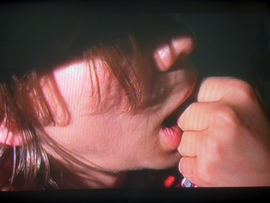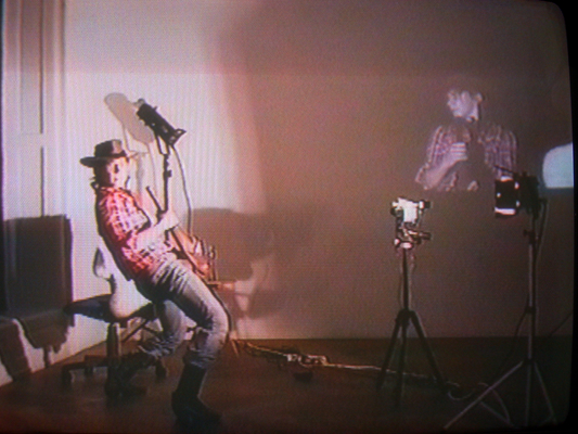 Material: Videokamera, Beamer, 8‘ Tonspur, Scheinwerfer, Bürostuhl mit Fell, Plastikkeule, Weidenzweig, Tetrapack Milch, Glas, Cherrytomate (Fliege).