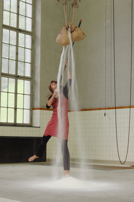 Sie lässt die rieselnde Masse in ihren Mund fließen, bis ein „Zuviel“ an Süße sie würgen lässt. Zusätzlich bildet der rinnende Zucker vulkanartige Kegel am Boden. Ihr Würgen entzaubert die erste eindrückliche Schönheit: Etwas ist nicht in Ordnung.