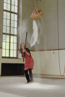 Bis sich Buchers Stechen und Bohren in einer völligen Zerstörung der Installation entlädt, durchläuft die Performance einen Prozess ständiger wiederkehrender Aggression gegen den hängenden Zuckersack, wobei jedoch immer wieder Bilder assoziativer Schönheit durch das unterschiedlich intensive Rinnen des Zuckers entstehen.