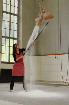 Dann schüttet die Künstlerin den intensiv roten Beerensaft in die Zuckermasse und wringt das Gazetuch mit ganzer Körperkraft. Die Gedanken angesichts der Bilder driften weiter hinab ins Dunkle: Es ist, als würden Därme gepresst, als würde Blut in dicken, schwarzen Schwallen auf den weißen Zucker rinnen. Vorbei ist es mit der süßlichen Schönheit des Anfangsbildes. Und genau dieser Bruch macht Bucher, Claudia;s performatives Werk so spannend: Sie bleibt nicht im Klischee einer weiblichen, „elfenhaften“ Person verhaftet, die schöne Bilder und Installationen mit spezifischen Verweisen auf weibliche Handlungsmuster und Materialien erschafft. Bucher geht weiter und führt auch den Betrachter an den Rand eines möglichen Abgrunds, in dem Dinge warten, deren Anblick einen schönen Traum in einen Alptraum verkehren können.