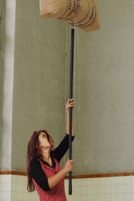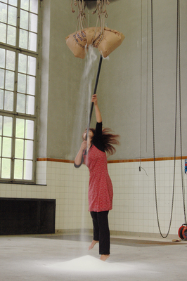 Jusqu'à ce que le piquage et le perçage de Bucher se traduisent par une destruction totale de l'installation, la performance passe par un processus d'agression permanente et récurrente contre le sac de sucre suspendu, mais des images de beauté associative apparaissent toujours à travers le ruissellement d'intensité variable du sucre...