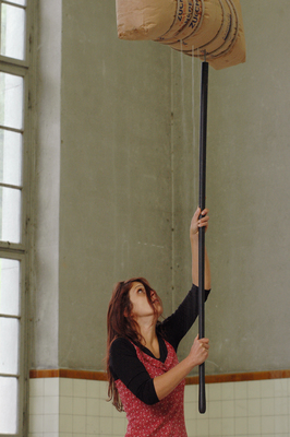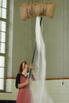 ...Dans "Ladung", le sucre est conservé dans un énorme sac accroché à la grue du hall industriel et Bucher le tire de toutes ses forces vers un endroit de la pièce. À l'aide d'une longue tige au bout de laquelle se trouve un objet pointu, semblable à une baïonnette, l'artiste dissout l'intégrité du "bloc de sucre" et lance le processus de la performance par le geste d'ouverture. Le sucre est d'abord transféré de son corps d'origine (le sac suspendu) au corps de Bucher (la bouche ouverte).
