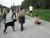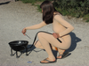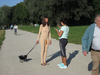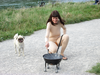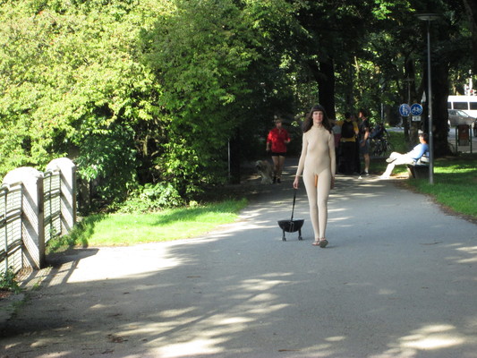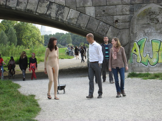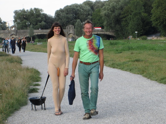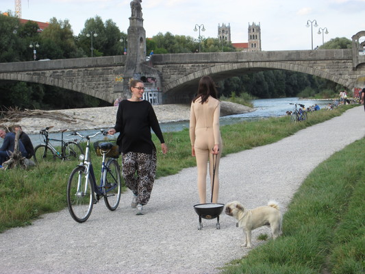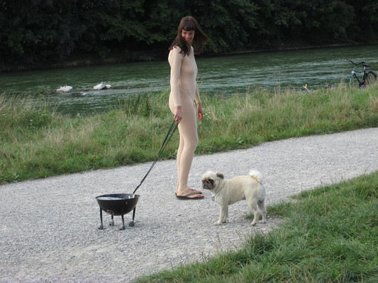 Dans l'espace public, je tire derrière moi, au bout d'une laisse, un barbecue sphérique allumé sur quatre "pattes" avec des roues, comme s'il s'agissait de mon chien. Je porte un body intégral de couleur chair. Une saucisse est attachée à une ficelle autour de mes reins.