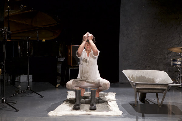 brouette, toile de gazon, boue, eau, vêtements blancs (chemise et leggings), bottes noires en caoutchouc