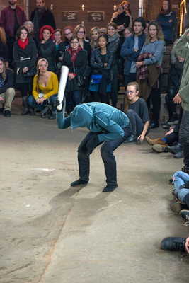 Déposer un contrôle d'un autre genre chez les spectateurs* : ils sont priés de se séparer de leurs iPhones pendant la performance, de les poser sur les trois longues tables, que je déplace ensuite 'à l'aveugle' sur le sol et vers d'autres endroits. Enfin, je me débarrasse de ma veste à capuche et de mon jean, sous lequel apparaît un dessin corporel avec des bandes noires de méridien, et je chante "Let's dance", de manière improvisée et plus riche en mots que les paroles originales de la chanson de David Bowie. Enfin, je rends à chaque interprète son iPhone.