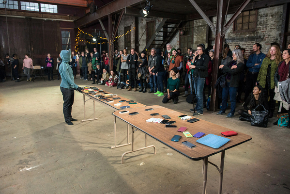Il pubblico ha un altro tipo di controllo: gli viene chiesto di togliere i propri iPhone durante la performance e di posizionarli sui tre lunghi tavoli, che poi trascino "alla cieca" sul pavimento e sposto in altri luoghi. Infine, mi spoglio della giacca con cappuccio e dei jeans, rivelando un disegno del corpo con "strisce meridiane" nere sotto, e canto "Let's dance", improvvisato e più verboso del testo originale della canzone di David Bowie. Infine, ma non per questo meno importante, restituisco a ogni performer il proprio iPhone.