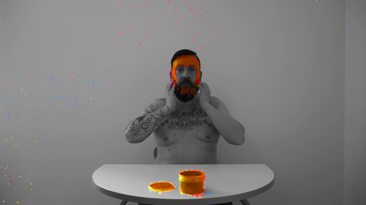 Ein Selbstporträt als Transformation. Ein Versuch, digitale Pixel in eine Art digitale Farbe zu verwandeln. Eine Hommage an meine Arbeit, bei der ich normalerweise Live-Performance mit interaktiven digitalen Medien kombiniere. Der Titel ist eine Anspielung auf den Namen der Fingerfarben, die von Kindern verwendet werden. Normalerweise hören sie auf, auf Papier zu spielen, und fangen an, es mit Farbe zu beschmieren. Der Kontrast zwischen dem schwarz-weißen Bühnenbild und der bunten Farbe verstärkt die Idee noch.