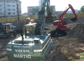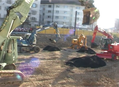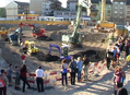 Performance von SCHWEIZER & SCHWEIZER Unbau kAG in Zusammenarbeit mit fünf Bauunternehmen der Grossbaustelle Nordtangente, eine Kreislaufchoreographie für sechs Bagger und zwanzig Tonnen Steinkohle Nordtangente - Kunsttangente, Einweihung der Voltahalle Basel, 2000