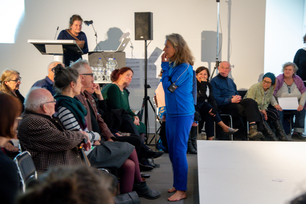 In Form einer Live-Gebrauchsanweisung stellt Claudia Grimm das dreiteilige Übungsset des Kollektivs DARTS (disappearing artists) vor. Die 9 Kunstschaffenden haben es zunächst für ihre eigenen Bedürfnisse entwickelt, für die „Anreicherung der Tage, der Kunst und der Körper“, wie sie sagen. Seit kurzem stellen sie es auch der Öffentlichkeit zur Verfügung. Der sogenannte Archifundus ist das Herzstück des Programms. Er besteht aus 3 kleinen Behältern. Darin wird, immer in Minimalformaten, „performables Material“ gesammelt. Das kann sich auf Kunst, kann sich aber auch auf den öffentlichen Raum, den Haushalt oder irgendeinen anderen Arbeitsplatz beziehen. Als Grundlage für das Übungsprogramm eignet sich der Archifundus deshalb, weil jeder Zugriff auf seinen Inhalt vom Nutzer, von der Nutzerin eine eigene aktuelle Verwendung des Materials verlangt. Die Vision des Kollektivs ist es, dass mittels des Archifundus und seiner Trainingseinheiten ein „performatives Gespinst entsteht, das alles einbezieht, was uns angeht“.