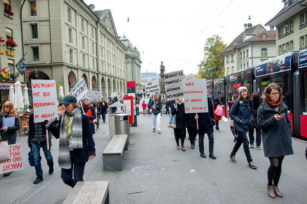 Ein Umzug als Performance. Eine Performance wird manifestiert, oder die Manifestation ist die Performance. Die Manifestierenden ziehen mit Statements und Fragen auf Schildern vom Kunstmuseum zur Kunsthalle, um dort auf die Aufzeichnung der Performance zu treffen – sie fand schon einmal statt. Durch die Wiederholung des Umzuges werden Performance und deren Aufzeichnungen, Manifestierungen und Realisierungen thematisiert. Damit werden Fragen danach ausgelöst, welches das eigentliche Ereignis und was die Rolle der Aufzeichnung ist. Daria Gusberti spielt mit Authentizität, Nachahmung, Aufzeichnung, Wiedergabe sowie der Rolle der Künstlerin und hinterfragt damit den Status der Performance und deren Aufzeichnungen allgemein.