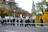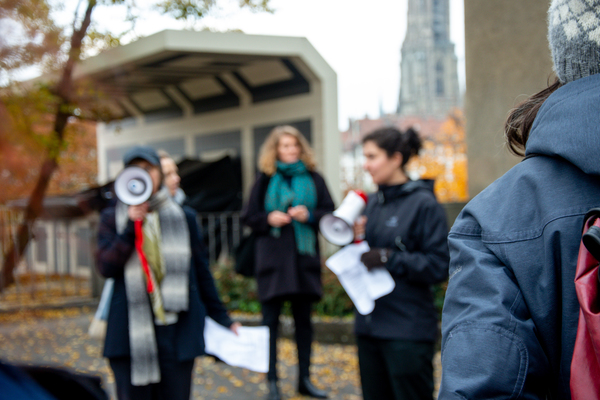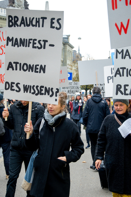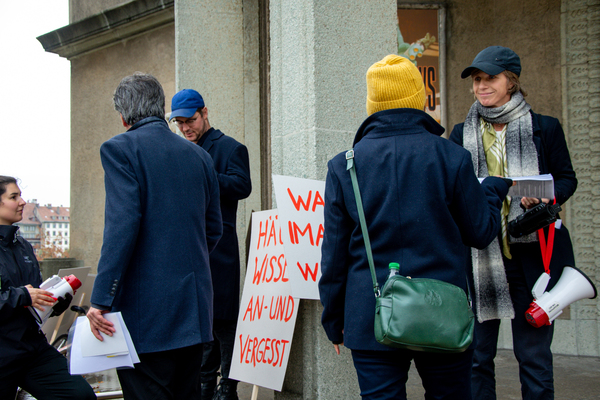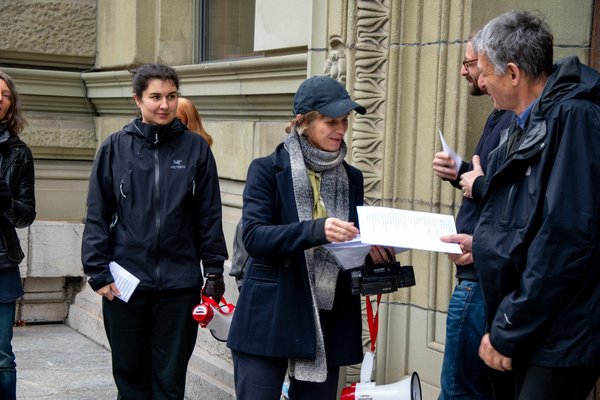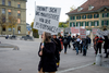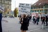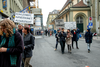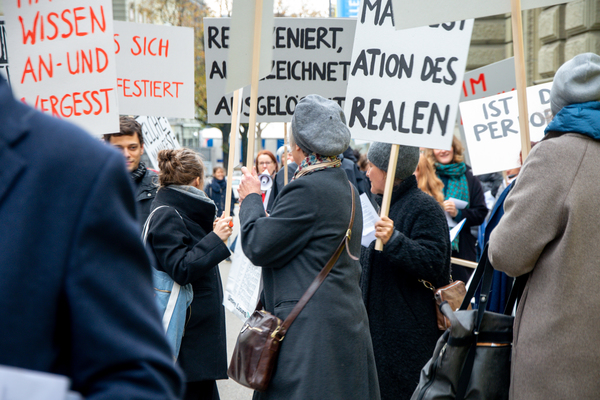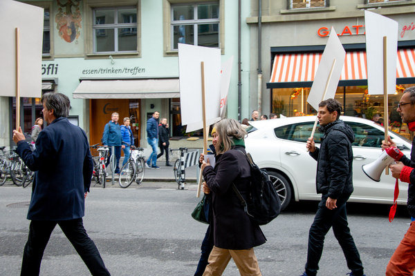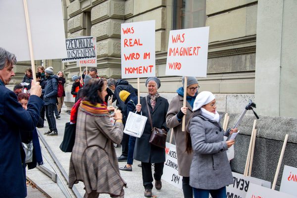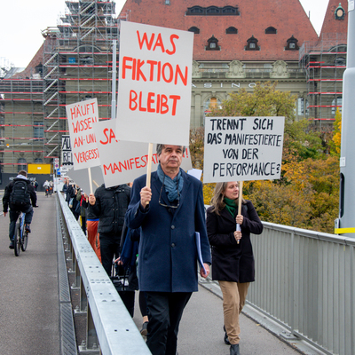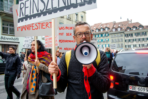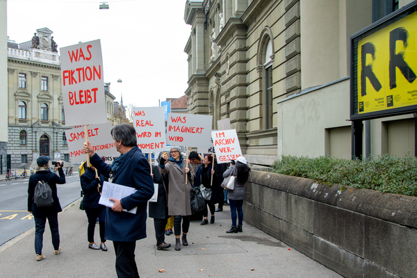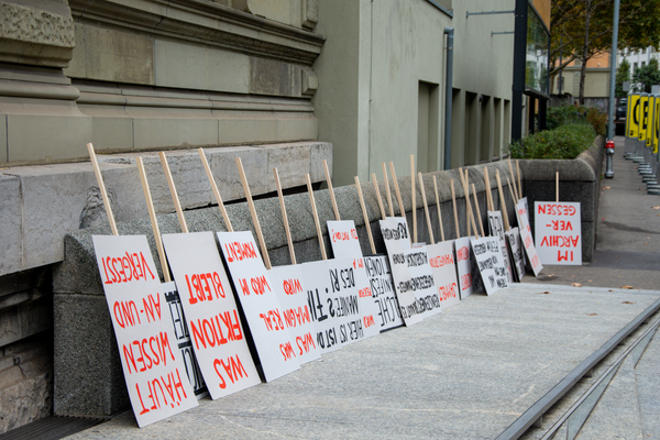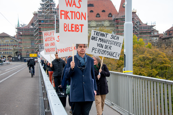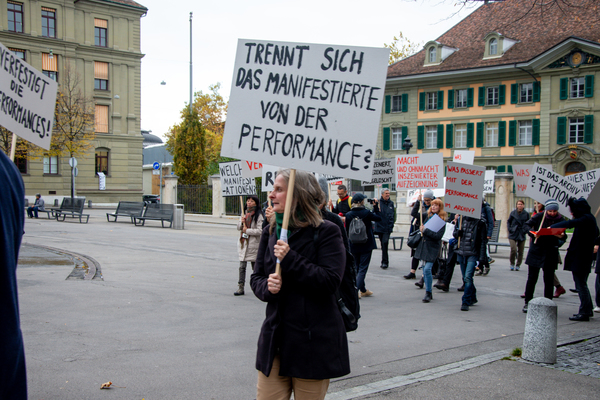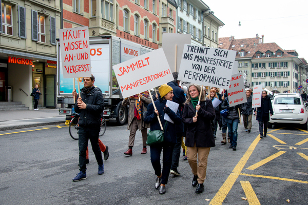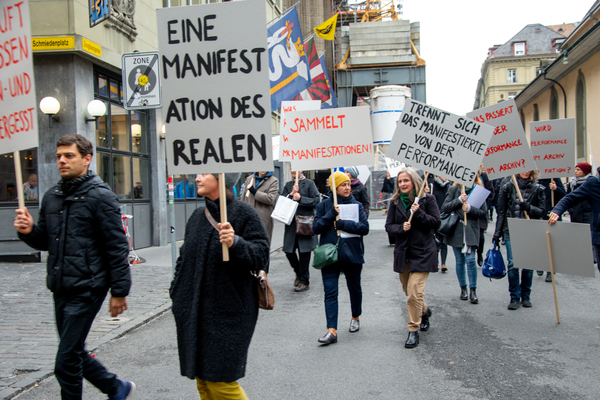 Ein Umzug als Performance. Eine Performance wird manifestiert, oder die Manifestation ist die Performance. Die Manifestierenden ziehen mit Statements und Fragen auf Schildern vom Kunstmuseum zur Kunsthalle, um dort auf die Aufzeichnung der Performance zu treffen – sie fand schon einmal statt. Durch die Wiederholung des Umzuges werden Performance und deren Aufzeichnungen, Manifestierungen und Realisierungen thematisiert. Damit werden Fragen danach ausgelöst, welches das eigentliche Ereignis und was die Rolle der Aufzeichnung ist. Daria Gusberti spielt mit Authentizität, Nachahmung, Aufzeichnung, Wiedergabe sowie der Rolle der Künstlerin und hinterfragt damit den Status der Performance und deren Aufzeichnungen allgemein.