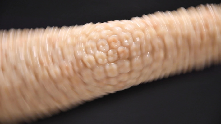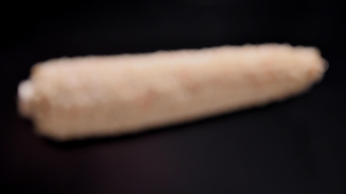 Jérôme Leubas artwork presents a ‚corn’ cob made of fake teeth that is shown from different perspectives. This is set into vibrations and fast rotations, so that it is not fully visible at first. The object is filmed from various angles against a black background, with the camera's focus dynamically oscillating between sharpness and blur. As the video progresses, the cob zooms in closer and closer so that towards the end you can see the individual fake teeth, but no longer have the whole cob in view. At the end there is just a black screen.