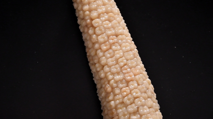 Corn originally comes from Mexico and is distributed all over the world. The grain is a staple food for many populations and cultures, as in Africa and Latin America. Moreover, according to the World Grain Index, corn is the most harvested cereal and the most traded cereal after wheat. In Europe, teeth or hard corn mixes (type of corn) are the most common. Jérôme Leuba could refer to these with his filmed or photographed teeth object, which he designed himself. He clarifies that we need our teeth in order to eat food.