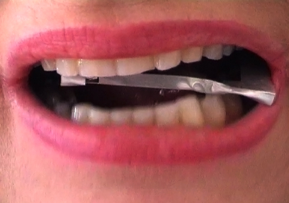 Tamar Nissim chooses a woman’s mouth as an orifice, title, and subject of her video. A reverse chronology is used. What we initially see, is actually the result of the formation process. Slow motions are alternated with fast ones. Close-ups of a mouth. It bites and chews undefined items that become concrete objects such as a double rectangle metal, a white round fabric on a squared plastic piece, a black disk, and a small round metal. Some viewers may realise that these are parts of a floppy disk: the shutter, the housing with the polyester sheet and the magnetic coated plastic disk with its hub, while the 2000s generation may just recognise the representation of the floppy disk as the save icon.