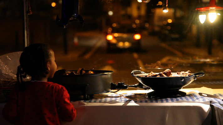 The buffet is laid out on a table in front of the window onto the street. The camera lingers on the centrepiece of the dinner, a “Zigni”, while a bus stops outside to let people on and off. The film is a reflection on our coming and going, on life's fates and on communities that are constituted around national dishes.