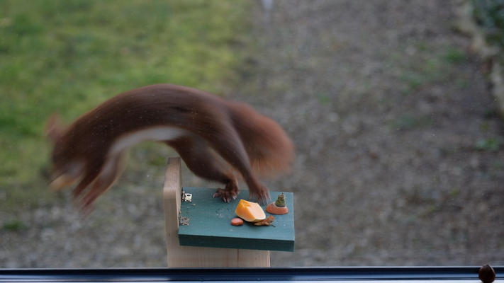 We want to make their acquaintance. To make them feel more at home with us, we organize a squirrel feeder. This differs from birdfeeder houses in that the food is not kept at the bottom, otherwise the birds would eat it away instead. One side of the squirrel house has a plexiglass wall so that the food can be seen from outside. Below the flat roof there is an opening of about three centimetres. This is where they are supposed to reach in. This doesn't work right away and so we invent a learning unit: The roof can be opened, because from here the nuts are filled in. We leave it open at first. At the first visit the red squirrel balances on it until it closes. And it quickly learns, slips through the opening with its upper body and grabs its nut.