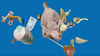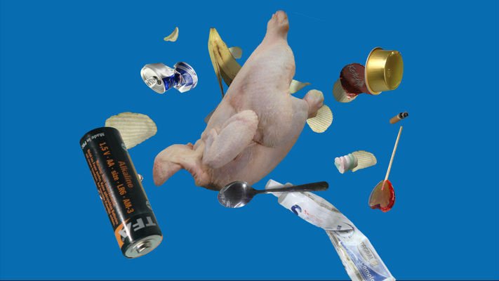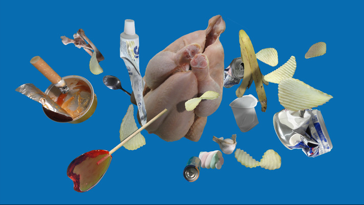 A raw chicken is at the centre of attention in Peter Aerschmann’s “Sputnik” video. A cigarette butt, gnawed-off bones, a lollipop, some toothpaste, a squashed can and a battery. Contemporary consumer goods function as satellites whilst product detritus becomes reminiscent of space junk. The naked and dead body of the chicken remains untouched. The video combines stages of raw food before preparation and one afterwards, with leftovers from the meal.