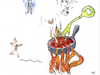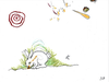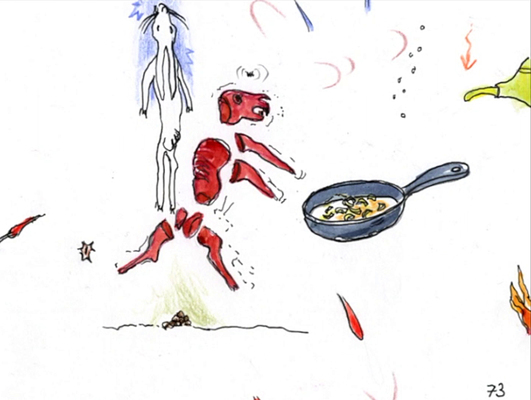 The motif of the white rabbit has been coined by cultural history. Magicians prefer to conjure such as these from out of their hat. In the story of “Alice in Wonderland” (the children’s book by Lewis Carroll was first published in 1865 under the original title of “Alice’s Adventures in Wonderland”) the girl follows a rabbit into the other world of dreams, fantasies and fairy tales, beyond our normal being. The white rabbit stands for something distinctive. It is just such an animal which must perish in Sonja Alhäuser’s animation. But it experiences an apotheosis: the white fur vanishes into the sky, whilst its body is vanquished in the pan.