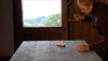 A buttered slice of bread used to be the staple meal of poor farmers. The view from the window looks out onto to a hilly landscape with two more farmhouses in the distance. It must be a rather lonely area where the video performance is taking place. The nailing onto the wood invokes the story of Jesus’ suffering and other magic nailing rituals. Or is it a personal discord? Franziska Bieri writes about this on her website: “What has been repeated over the years is what leaves its mark. It sticks as if it had been hammered in. It sticks even when we see that it's out of date and has accumulated dust.”