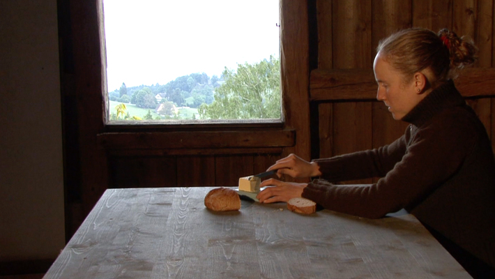 Like many of the artist’s works, the video “Hammering in” is related to her place of origin, in a rural Catholic village in Central Switzerland. Franziska Bieri appears as a performer. In an austere farmhouse parlour, she cuts off a slice of bread and spreads it with butter - without using a plate, directly onto the wooden table. She then nails the slice to the table with seven large nails and strong blows. The last scene shows the artist blowing dust up from the tabletop and then stepping out of the picture. Dust or dirt has probably been collecting for years. Is the parlour still inhabited? Or has the artist returned especially for this gesture?