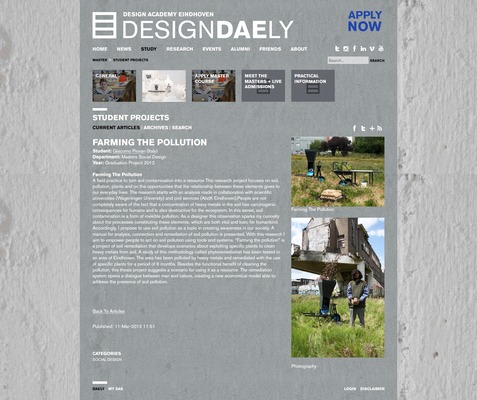 A field practice to turn soil contamination into a resource This research project focuses on soil, pollution, plants and on the opportunities that the relationship between these elements gives to our everyday lives. The research starts with an analysis made in collaboration with scientific universities (Wageningen University) and civil services (AbdK Eindhoven).