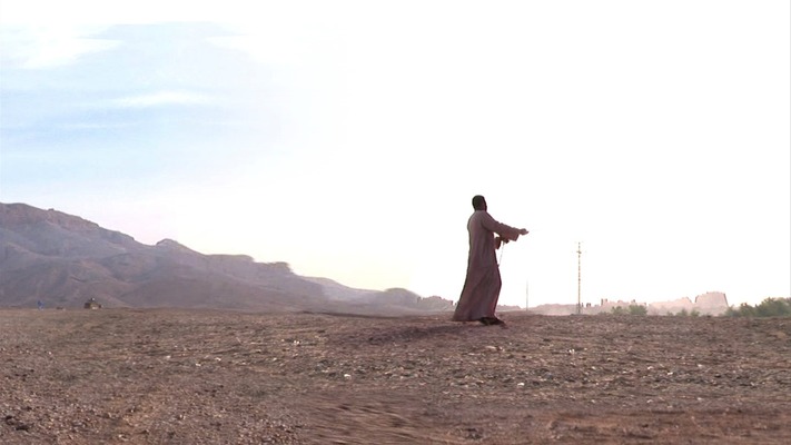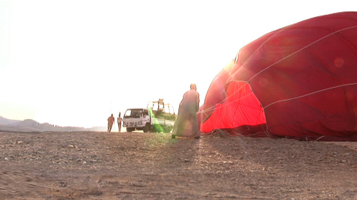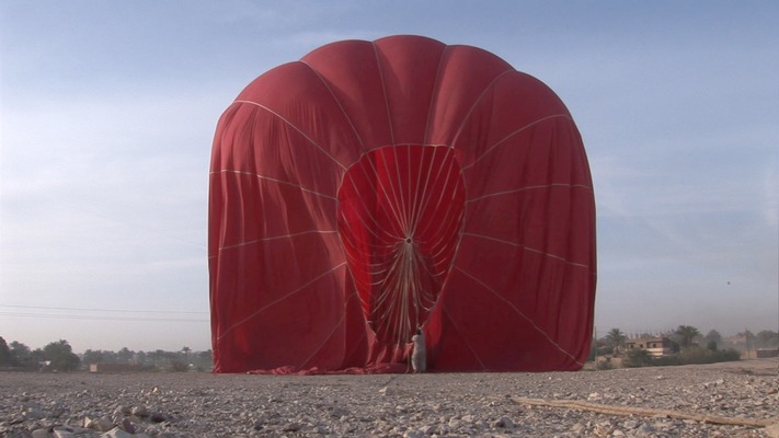 Outside of Luxor, the gaze slowly scans the desert in a full circle. Single figures, groups, a donkey and a hot air balloon glide past, but the situation as a whole remains undefined. Christoph Oertli cut out parts of scenes from the original film material and recomposed them in animation, shifting the spatial and temporal sequences. A long, slow pan recapitulates the landing of a red balloon, the arrival of tourists on a strange planet.