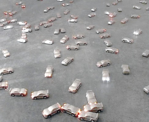 "The cars appear to be moving in disorder around a room, whilst their lights are constantly flashing like a pulse, as if some sort of emergency or alarming situation were unfolding. Each vehicle is equipped with a sensor so that whenever two cars collide, they change their travelling direction. The artist has built a microphone into a car, which constantly broadcasts acoustic signals of the collisions to the video, without us viewers being able to discern which car in the network was responsible. Cars, modules, molecules, individuals ... Eller does not ask the question of the car or the machine as an object, but poses the question of determining the location of a factor within a mass of constantly changing factors", according to the art critic and author Sabine Gamper.
