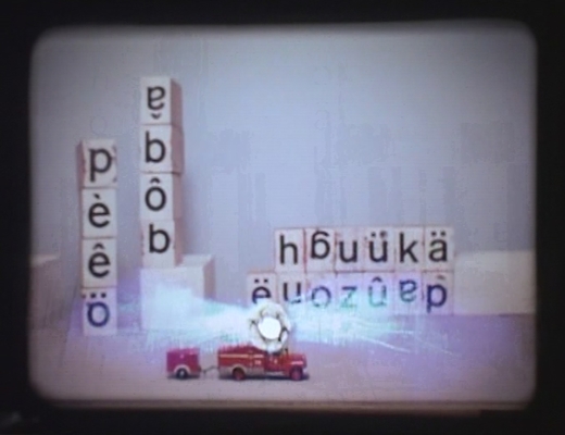 In this frame by frame animation, Mathis Vass shows toy models of fire trucks as the protagonists of the piece, continuall driving from left to right. All the while the background moves along with the models and creates the impression that the viewer is driving beside them. The effect is that of the fire tricks driving at high speeds overtaking the viewer in an endless stream. Hence the title "Überholspur", the German word for „fast lane“. Despite the playful attitude with a touch of irony Vass creates a sense of urgency the cause of which is never seen. The background appears alive due to small figures, white cuboids with letters, numbers and symbols printed on them which rapidly shift position as the animation continues. It is unknown what these figures represent, whether they are symbolic for human figures, the passing urban landscape, or an abstract expressen for sounds and voices.